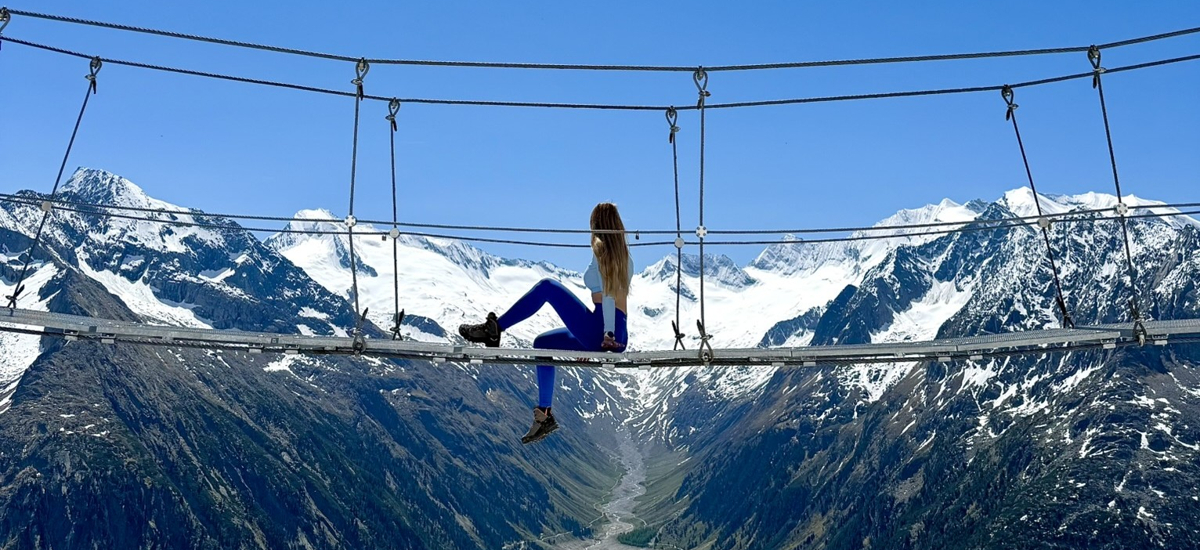 Posledných pár metrov prechádza cez vysokohorskú lúku a skalné pole. Odmenou za výšľap nám bola chata s panoramatickými oknami, veľkou terasou zaliatou slnkom a slovenskými chatármi. Vďaka jej špecifickej architektúre s nádychom luxusu sme sa cítili ako v après-ski niektorého z okolitých lyžiarskych stredísk.Po oddychu pri radleri a čokoládovej tyčinke sme sa vybrali k cieľu našej návštevy – ikonickému visutému mostíku Hängebrücke, ktorý sa nachádza kúsok za chatou.