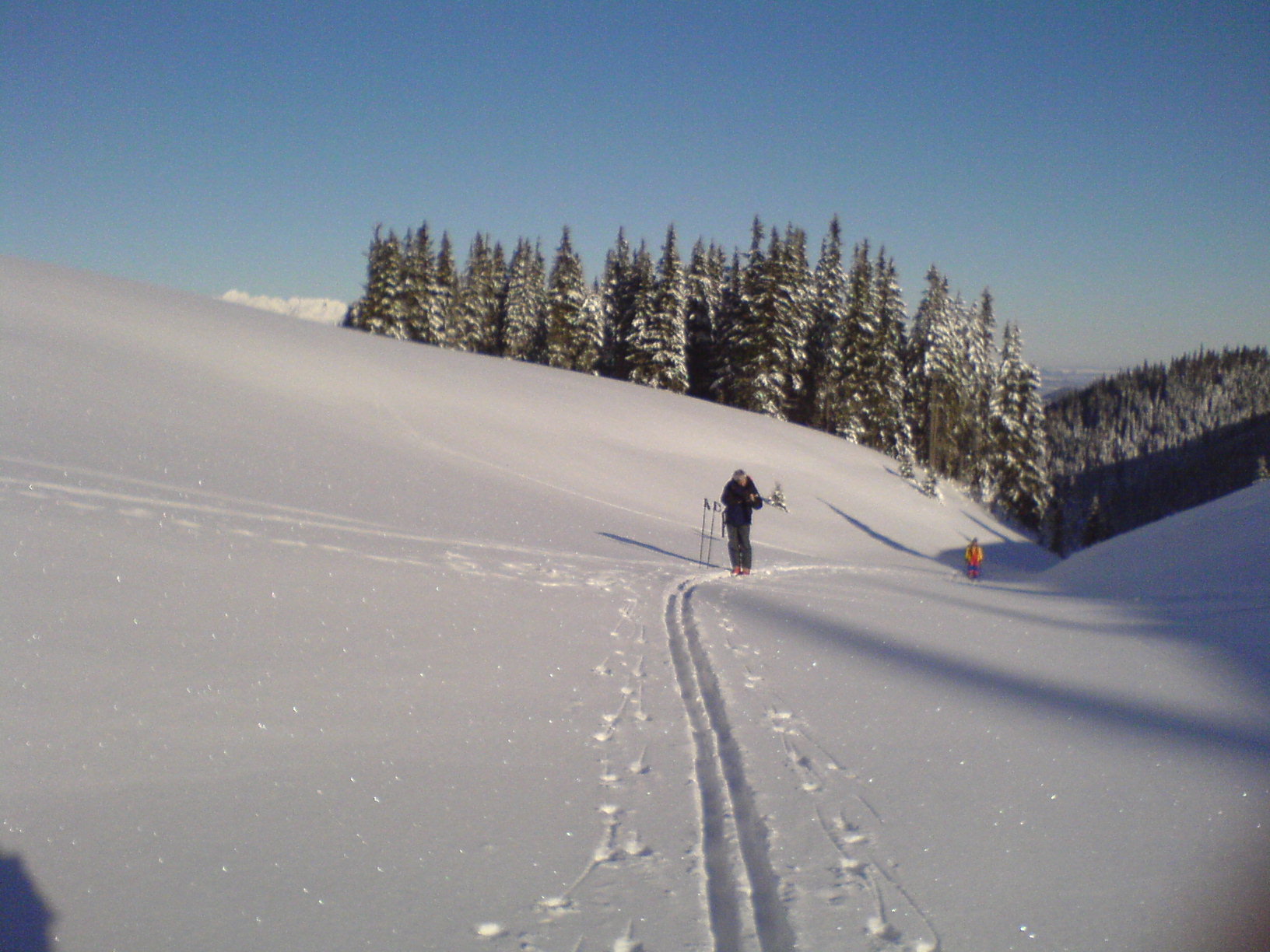 Takže hore je na kašu snehu. V 1500 mnm cca 60-70 cm. Trávnaté lúky sa dajú v pohode. V lese by to šlo po zvážnici do 900 mnm bez škrtnutia o šutre. Takto to je v okolí Podbanského. Skoro sme plakali, že nemáme lyžky.